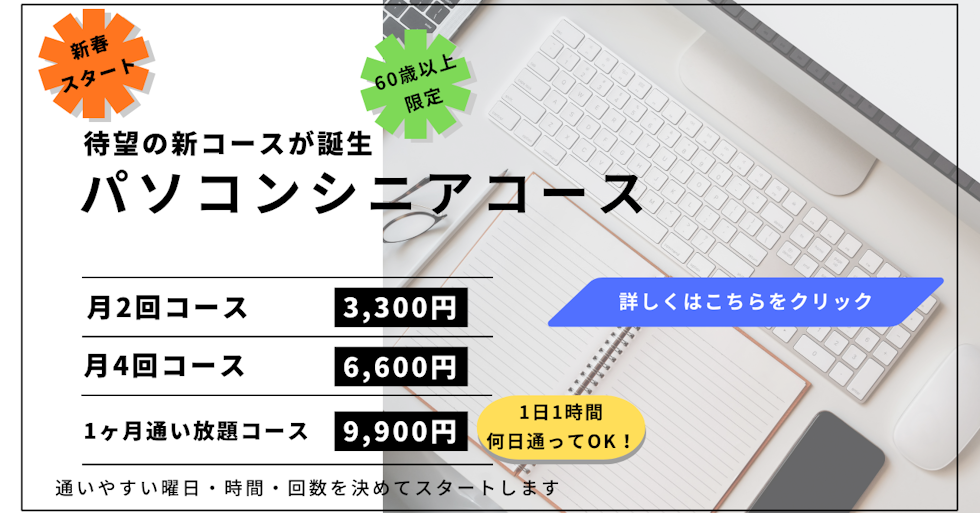 パソコンシニアコース 2026年新春より、待望の新コースが誕生します 60歳以上限定、リーズナブルな受講料でパソコン入門・Word・Excelなどが身につくコースです ※通いやすい曜日・時間・回数を決めてスタートします …