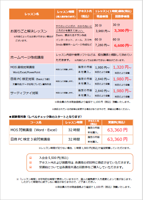 主なレッスン料金表